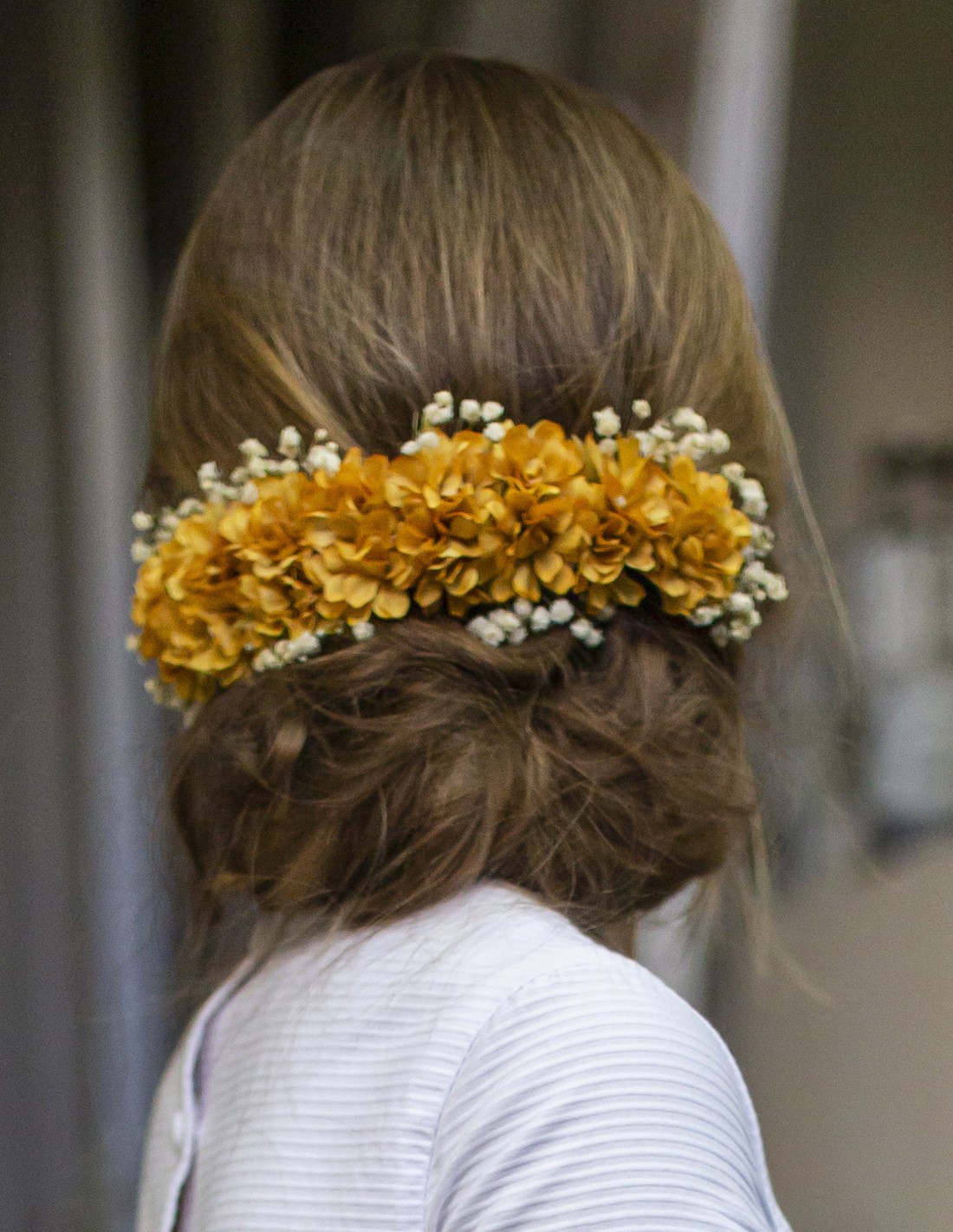 Tocado de flores preservadas y paniculata en tonos mostaza.