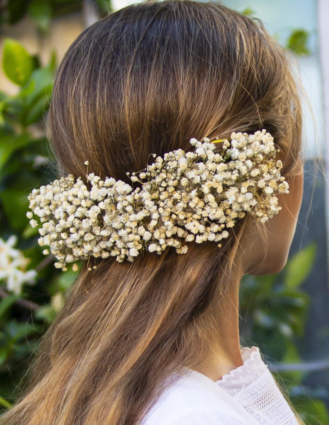 Tocado modelo Paniculata blanca con flores preservadas en tonos blanco roto y confeccionado como corona entera y media corona.