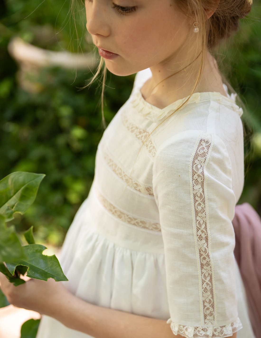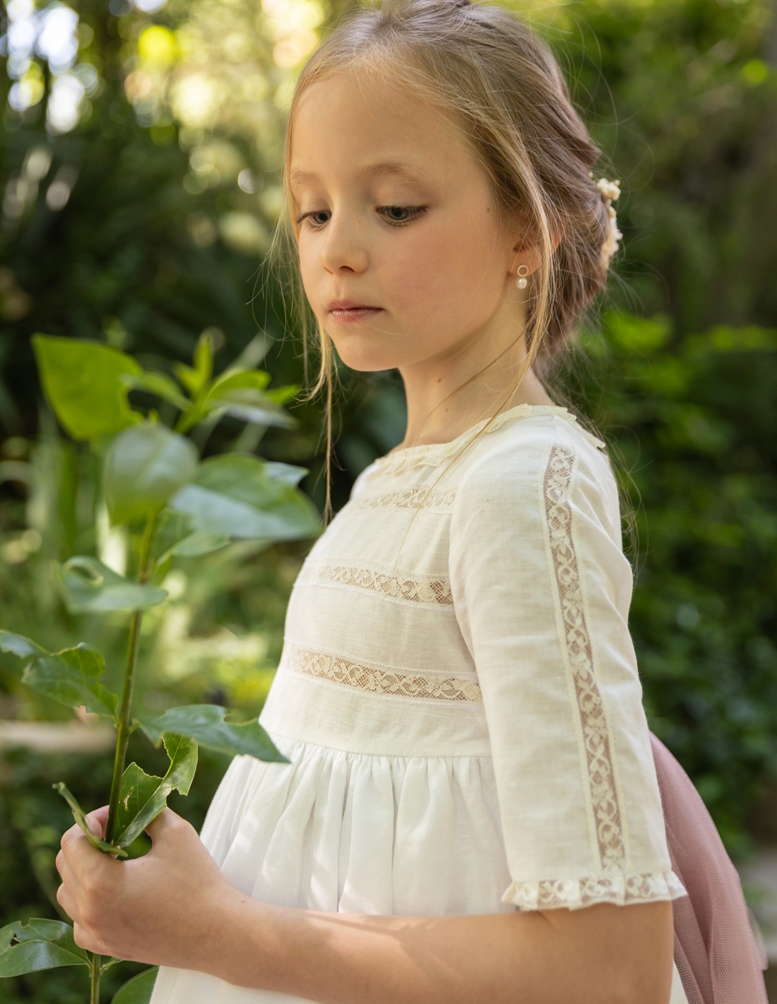 El vestido de Primera Comunión Verona está confeccionado en lino blanco natural con mezcla de algodón. Un fino entredós recorre el pecho en tres líneas horizontales. El mismo entredós adorna las mangas y el cuello del vestido. La parte inferior de la falda aparece dividida en tres partes gracias al mismo entredós. El lazo de tul mórbido rosa talco está cosido a los costados del vestido.
