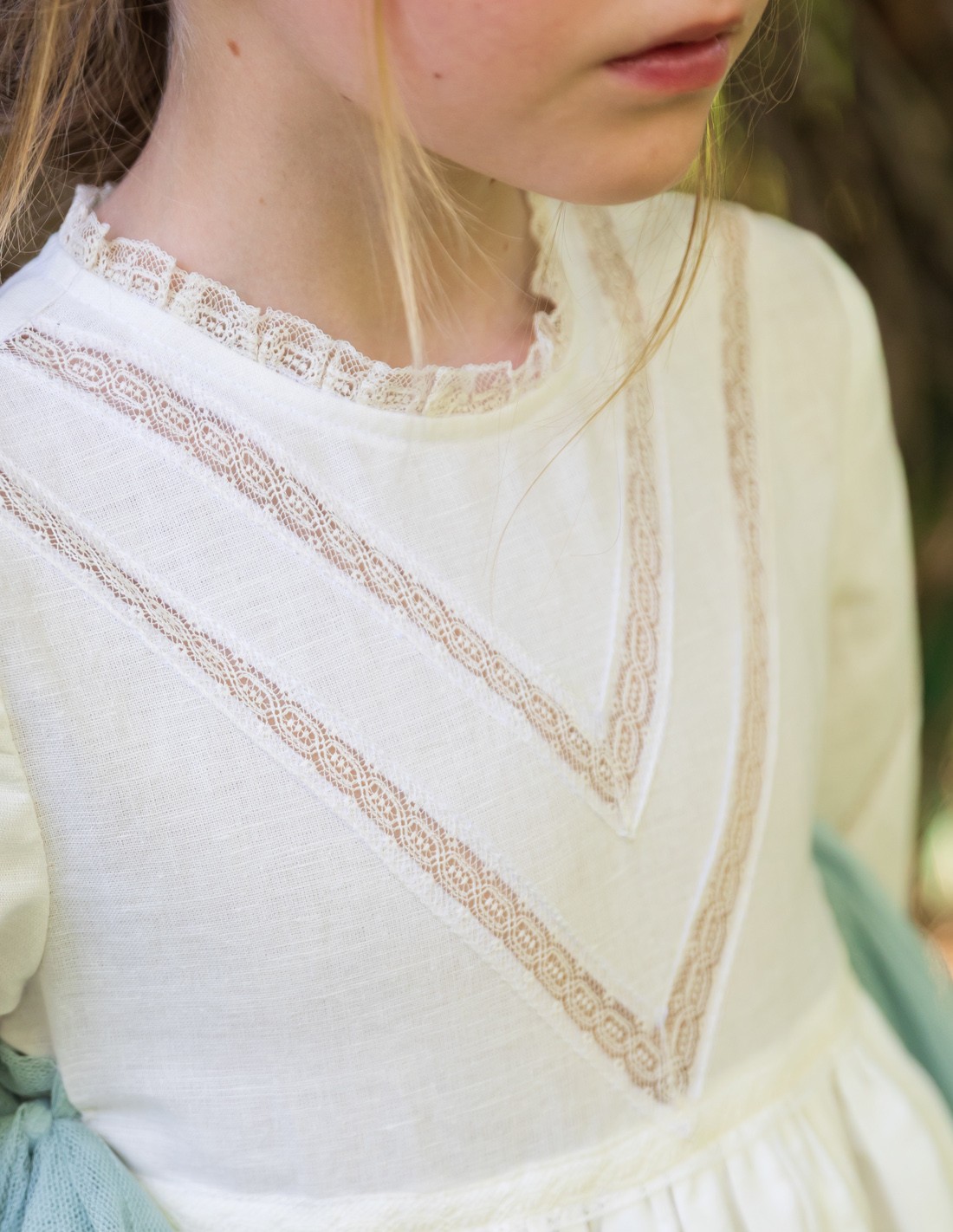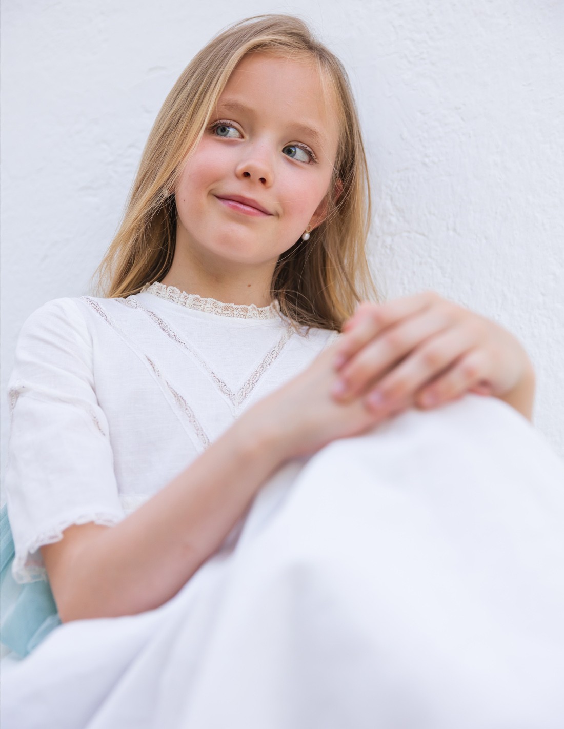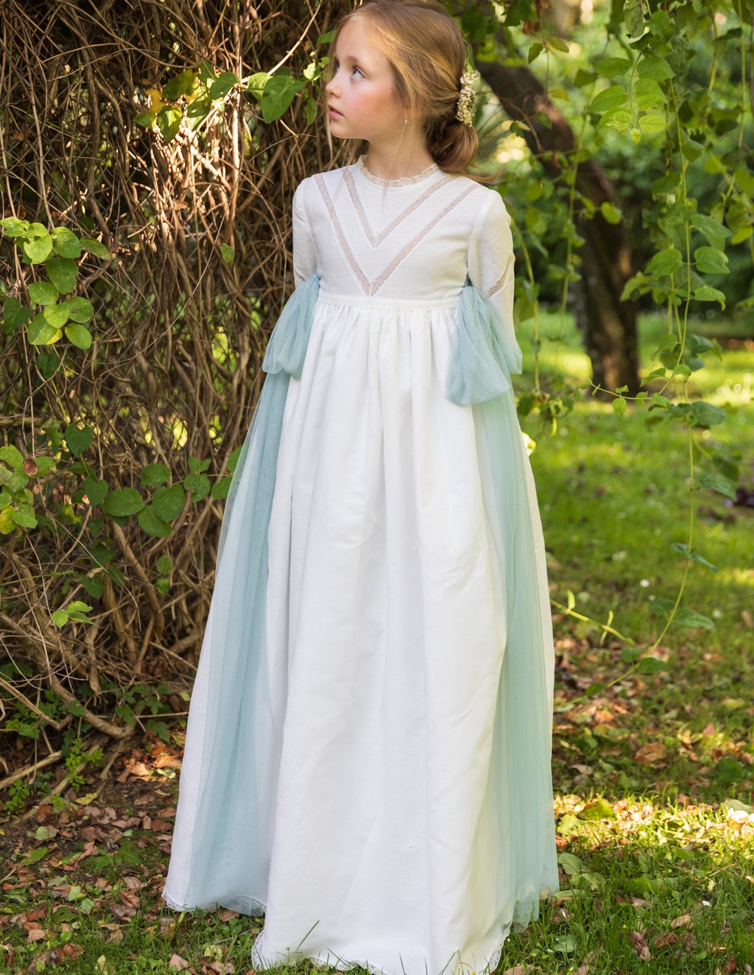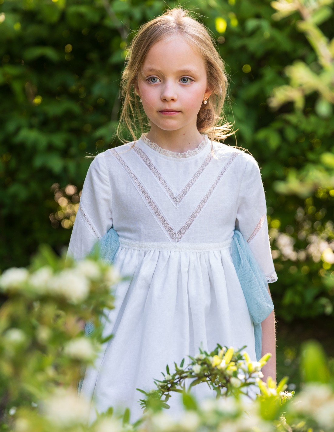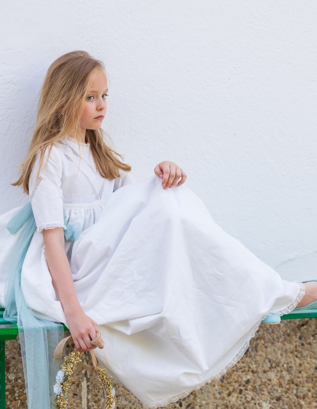 El vestido de Primera Comunión Génova está confeccionado en lino blanco natural con mezcla de algodón. Un fino entredós de tipo valenciene recorre pecho, mangas, cuello y bajo del vestido. El lazo de tul mórbido está cosido a los costados del vestido. Aunque en las fotos aparece el lazo aguamarina, actualmente se está entregando con lazo ámbar, aunque puede pedirse en cualquier otro color de la colección.